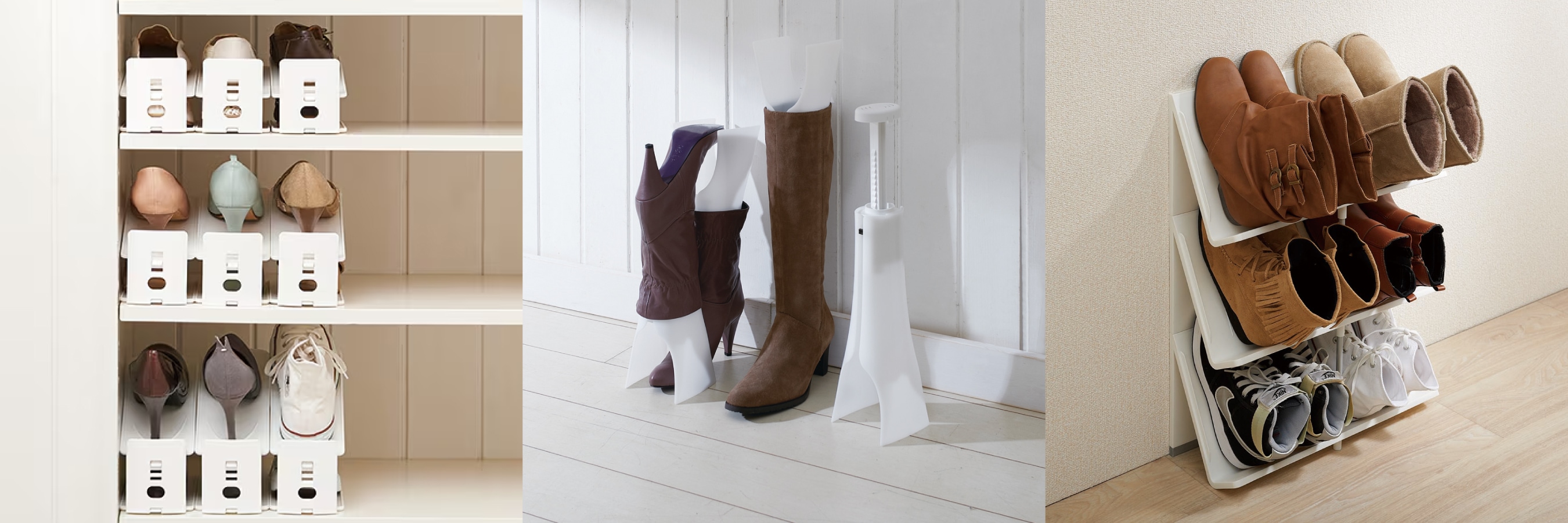 型崩れしたくないブーツには、ブーツスペースセーバーがおすすめ。1足分のスペースで、ミドルサイズからロングサイズまで様々なブーツを収納できます。消臭剤(別売り)を設置できるので、お気に入りのブーツを長く楽しむことができます。