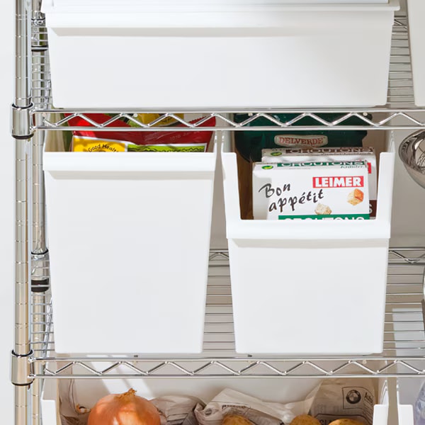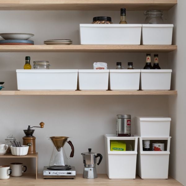 パントリーの棚で食品ストックやカトラリーの整頓、ビンやカンの分別にもおすすめ。