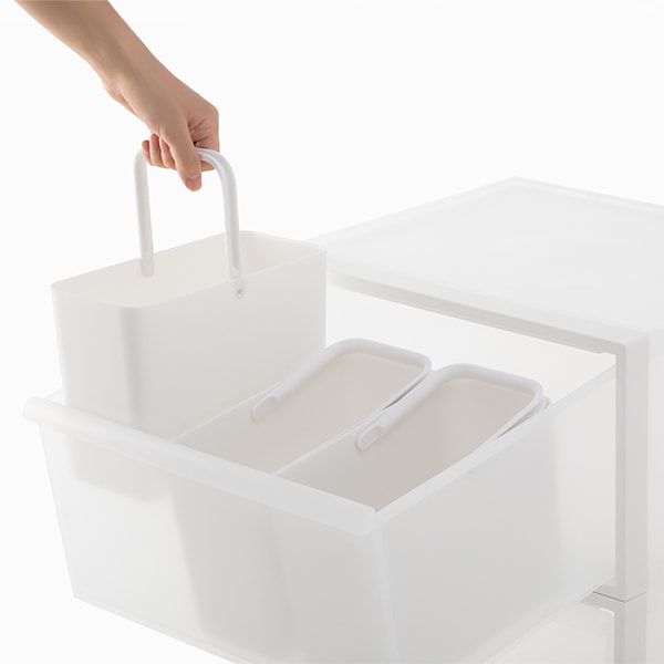 クローゼットシステムワイドのインナーケースとして、スリムは3個・ワイドは2個がぴったり収まる。ハンドル付きで取出しも簡単。