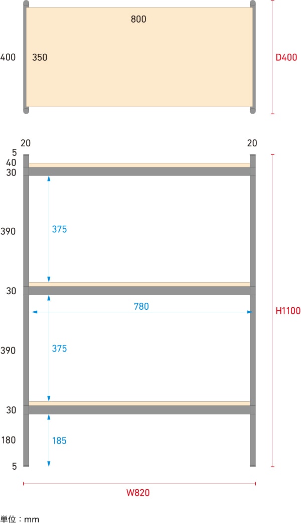 シェルビングシステム 追加ユニット 縦1段 ショート(棚板350用)SHEL-U-05
