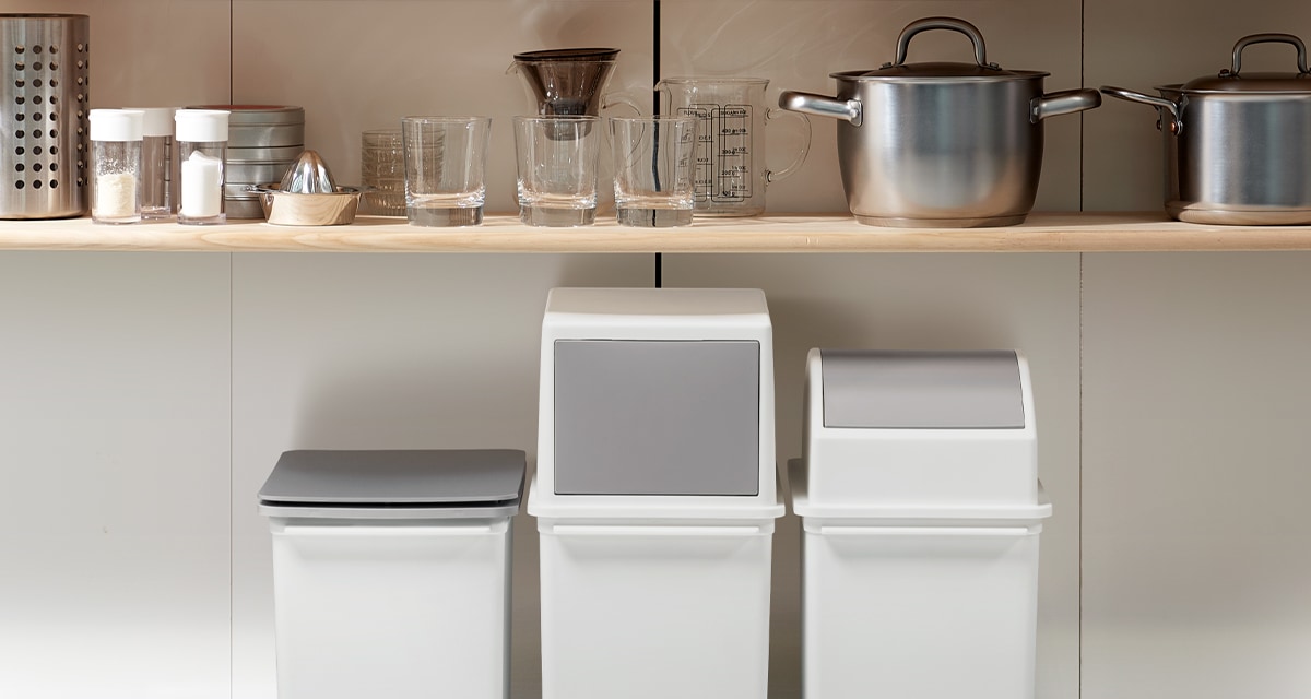 オープンスペースや棚下に、さまざまな場所で活躍できるダストボックスシリーズ。 複数個を横に並べたり、フロントオープンタイプを下段に置いた積み重ねなどで分別も可能。 幅違いのフロントオープンタイプに加え、プッシュタイプ、スイングタイプの3種類から、ライフスタイルに合ったフタをお選びいただけます。