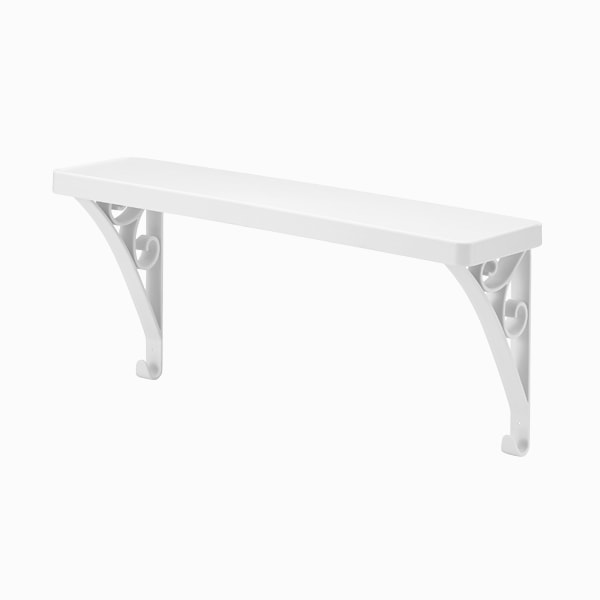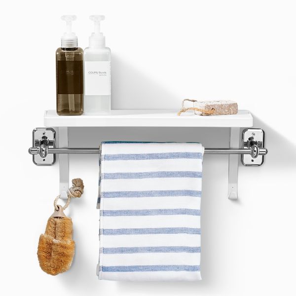 タオルバーに差し込むだけで簡単に設置できるシェルフ スライド脚でタオルバーのサイズに合わせて設置可能。 ちょっとしたモノを吊るせるフック付き。 付属ネジで壁への設置も可能です。