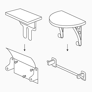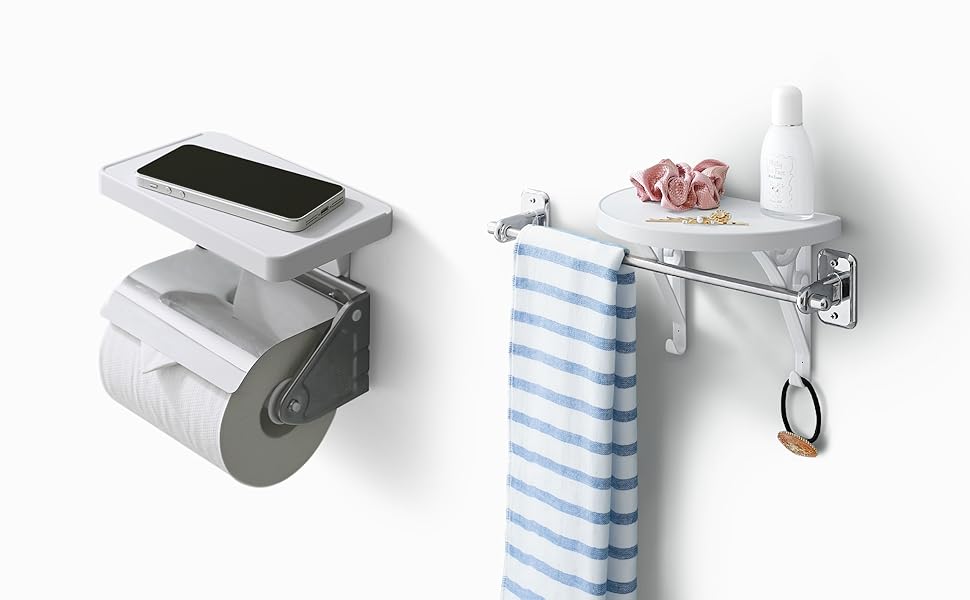 ペーパーホルダーやタオルバーのネジを緩めて、ベースを差し込み締め直すだけで設置完了。タオルバーシェルフはネジ無しでも設置可能です。